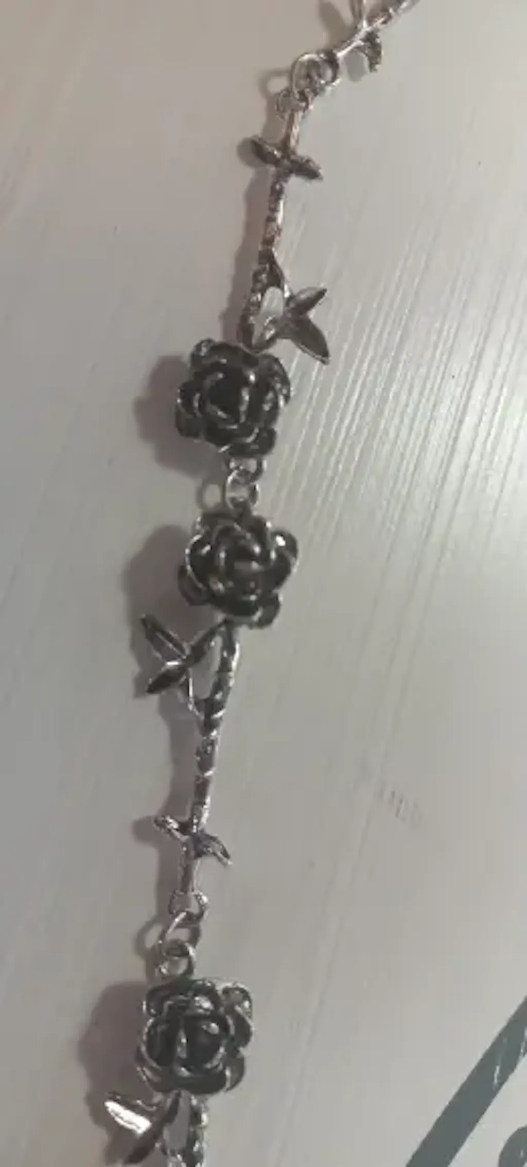 Durable metal alloy with a sleek black finish and finely detailed rose and thorn accents.